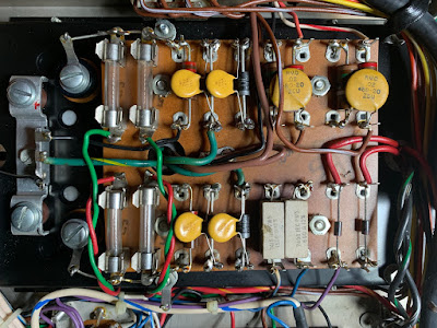 Tanto las secciones de amplificación, preamplificación y regulación se disponen en una serie de placas enchufables. En todas ellas se procedió a sustituir los condensadores, Nichicon FG para las secciones de audio, y Vishay o Panasonic FC para el resto. El condensador de acoplo de la VAS, originalmente de tantalio, se sustituyó por un WIMA de polipropileno.![]() |
